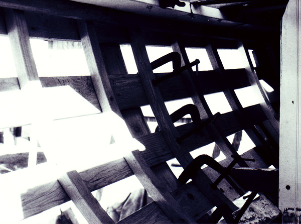 ![]() New planks in place; Note the form (on right) taken from the opposite side to align planks and restore hull shape |