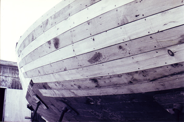 ![]() The second diagonal layer going on the stbd side; planks are staggered up & down to diminish edge-setting |