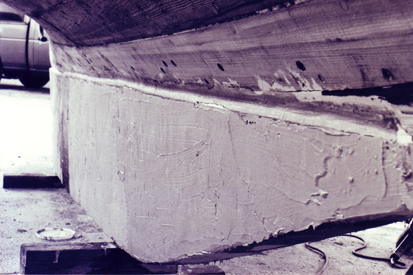 ![]() The epoxy-faired lead ballast, view from forward, before sanding, showing rabbeted garboard |
