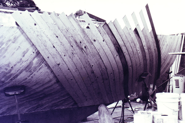 ![]() Next "shutter" planks are spiled and installed between the initial staggered planks. Even though we are cold-molding over the hull, the new planks are carefully fitted, caulked and seams paid |