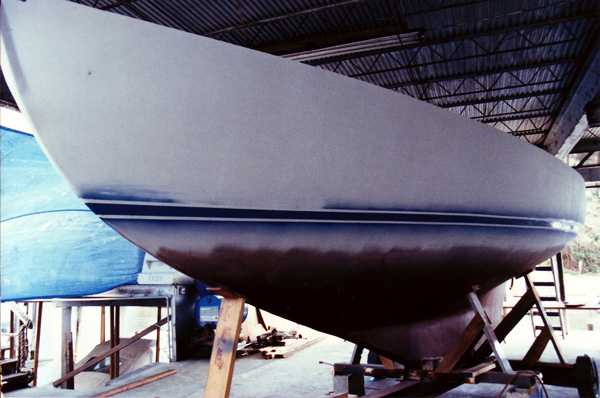 ![]() White primer has been sprayed over the sanded high-build primer (topsides), and the boot stripe has been sprayed using linear polyurethane |