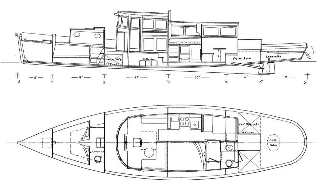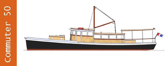 ACCOMODATIONS Two private double cabins. Full heads are provided for each cabin. Lounge in pilothouse. Full galley and settee/dinette in main cabin. Large covered fantail deck with table over engine compartment, room for director chairs, lounging, etc. Fantail roof can be hard top or removable canvas. Large foredeck. A ten-foot dinghy or two can be carried on the house coachroof.