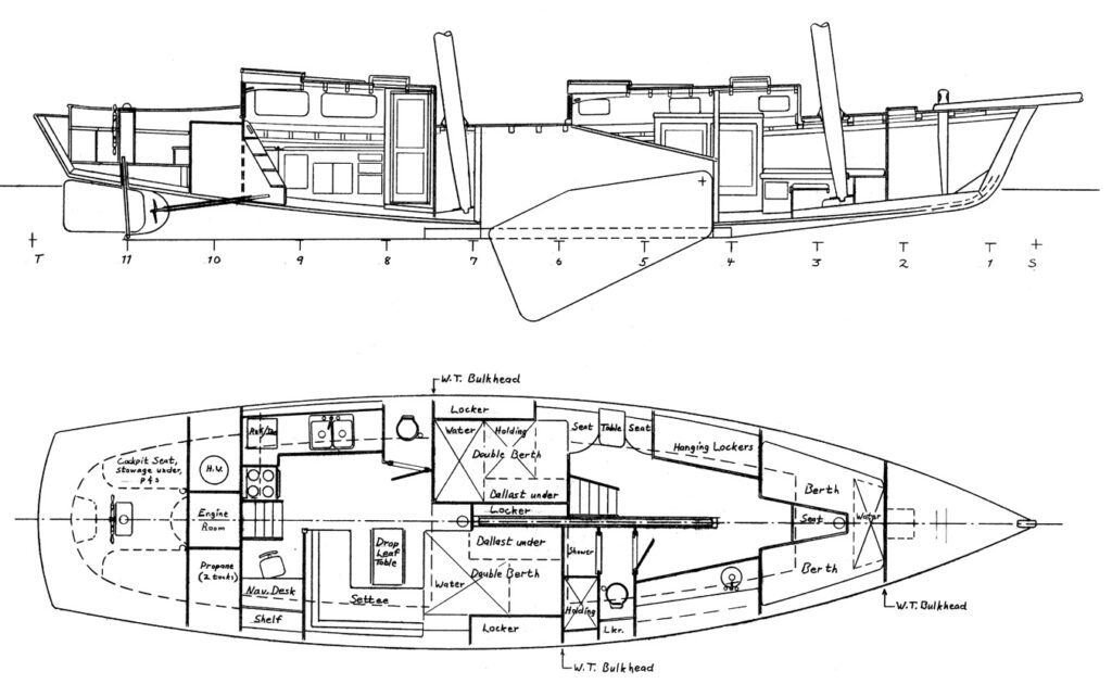 CONSTRUCTION Cold molded wood/epoxy/fabric: Hull bottom — double diagonal 1/2″ ply planks over 13/16″ tongue and groove lumber (finished thickness 1 7/8″). Hull topsides — double laminated 1/2″ ply. Decks — double laminated 3/8″ ply over sawn beams. All exterior surfaces covered with epoxy-impregnated Xynole-polyester fabric and linear-polyurethane painted.