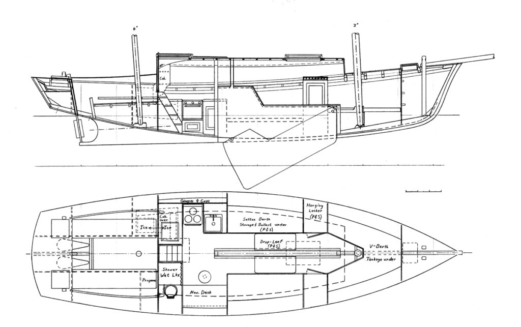 CONSTRUCTION Cold molded wood/epoxy/fabric: Bottom–double diagonal marine ply planks (¼” x 6”) over 5/8” tongue and groove planking laid fore and aft. Sides–double laminated ¼” marine ply. Decks–double laminated 1/4″ marine ply over sawn beams. Covering system–epoxy impregnated Xynole-polyester cloth finished with linear polyurethane paint systems. Spars–mast(s) hollow octagonal (Bird’s Mouth) laminated Douglas fir/epoxy, booms solid Douglas fir. Interior–painted ply trimmed with varnished hardwoods.
