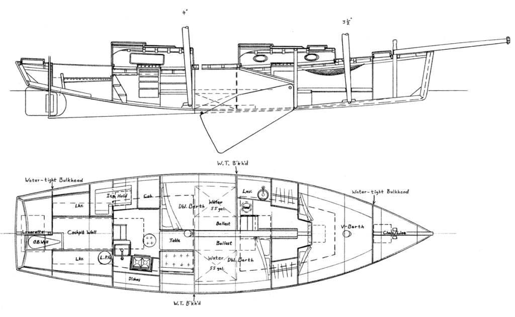 | CONSTRUCTION | QUICK-MOLDED: Epoxy/fabric covered laminated plywood. Bottom: Double diagonal 5/8″ x 12″ x 8′ plywood planking over longitudinal stringers and partial backbone. Sides and deck: 5/8″ plywood. Spars: solid Douglas fir. Interior: Painted plywood trimmed with hardwoods. |