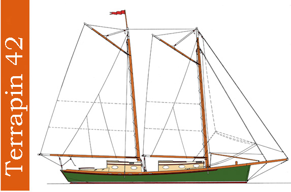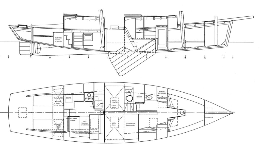 double diagonal 3/4″x24″x12′ ply planking over partial backbone and stringers. Sides: 3/4″ ply with butt blocks. Sheer clamps and chine logs laminated from 1×4 stock. Decks 5/8″ ply over sawn beams. Trunks: 3/4″ ply. Coach roofs: 1/2″ ply over sawn beams. Masts: solid or hollow laminated Douglas fir (hexagonal or two-sided). Booms: from solid Douglas fir 6×6 stock. Gaffs: from solid 4×4 stock. Interior: painted plywood trimmed with hardwoods. OPTIONS Complete plans include the construction manual THE NEW COLD MOLDED BOATBUILDING. Different rigs and interiors, including commercial layouts (maximum capacity 7 U.S. tons) can be custom drawn.